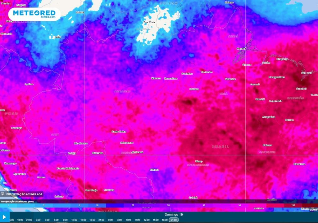 Mas não é só a região de Manaus a ser afetada pelas chuvas! Grande parte da porção leste e sul da região Norte do Brasil poderá registrar volumes muito expressivos de chuva nos próximos dias, especialmente no estado do Pará, Tocantins e sul do Amazonas. Para essas regiões são previstos acumulados de até 200 mm até o próximo domingo (19).