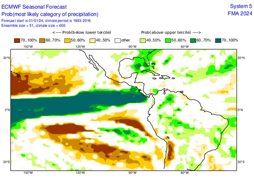 Dessa forma, modelos como o ECMWF projetam acumulados de precipitação próximos a média climatológica ou até mesmo acima da média em partes do Norte do Brasil, o que indica que as chuvas continuarão ocorrendo na região e, com isso, o processo de cheias dos rios continuará ocorrendo, deixando no passado o cenário de seca severa de 2023.
