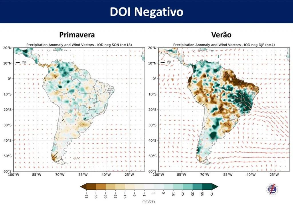 Já para o Brasil o impacto do Dipolo do Oceano Índico vem através de um trem de ondas atmosférico (as chamadas ondas de Rossby), que parte do leste do Índico e chega até a porção subtropical do Atlântico Sul, próximo a costa sudeste da América do Sul. No caso da fase negativa do dipolo, o padrão de ondas que é disparado geralmente acaba favorecendo uma circulação ciclônica próxima à costa entre as regiões Sul e Sudeste. Isso quer dizer que provavelmente teremos uma maior atuação e frequência de ciclones e sistemas frontais nesta região.