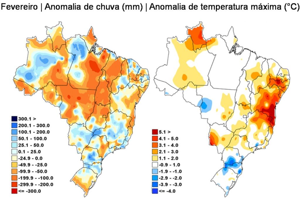 Diferente de janeiro onde um bloqueio resultou em chuvas muito abaixo da média no centro-leste do Brasil, o mês de fevereiro apresentou maior regularidade da precipitação, inclusive em áreas do Sudeste e Centro-Oeste afetadas pela estiagem no começo do ano.