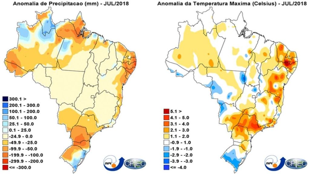 Julho foi mais um mês marcado pela falta de chuvas em grande parte do país. Além da falta de chuvas, esse mês também registrou temperaturas mais altas que o normal para o período de inverno.
