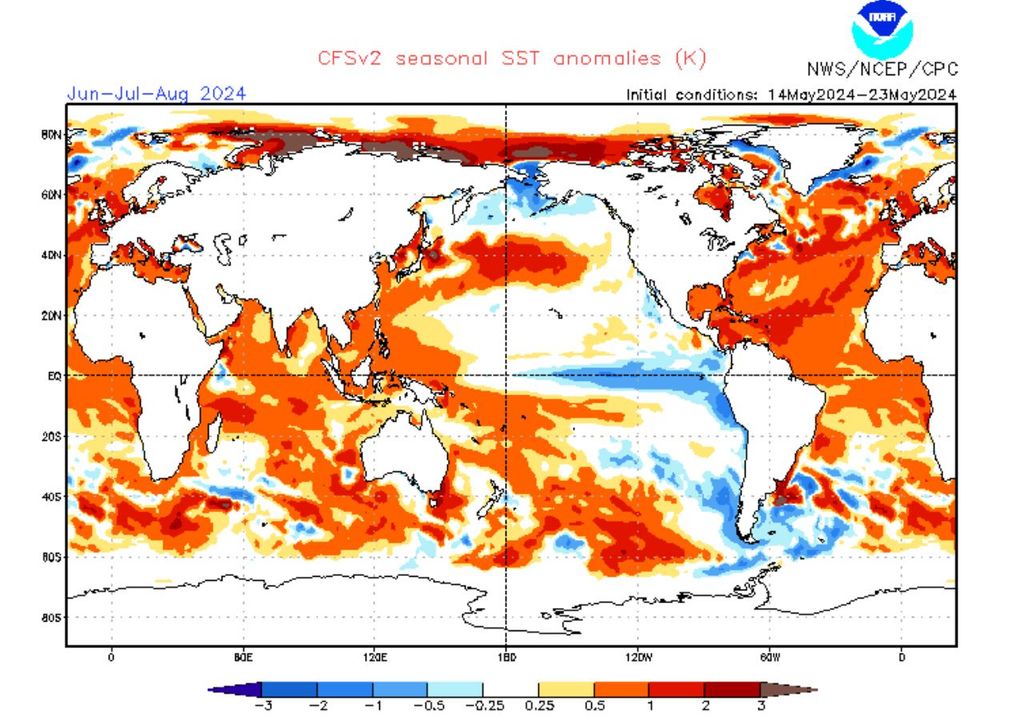 Em relação as anomalias de Temperatura da Superfície do Mar (TSM), o El Niño oficialmente encerrou a sua temporada no Oceano Pacífico. As TSM na região Niño 3.4 voltaram a ficar abaixo de +0,5°C no início de maio, com cerca de +0,3°C, e atualmente estão próximas do limiar de +0,2°C.