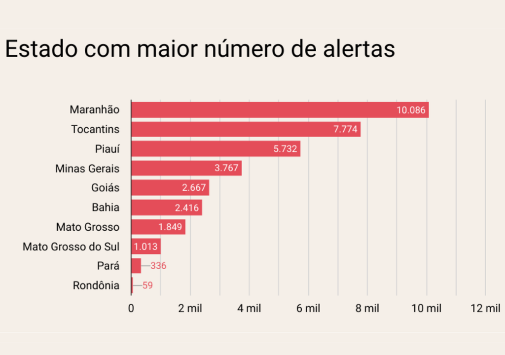 Atualmente, os estados com o maior número de alertas são: Maranhão, com 10.086; Tocantins, com 7.774; Piauí, com 5.732; Minas Gerais, com 3.767; Goiás, com 2.667; e Bahia, com 2.416. Os dados equivalem ao período de janeiro de 2024 a julho de 2024.