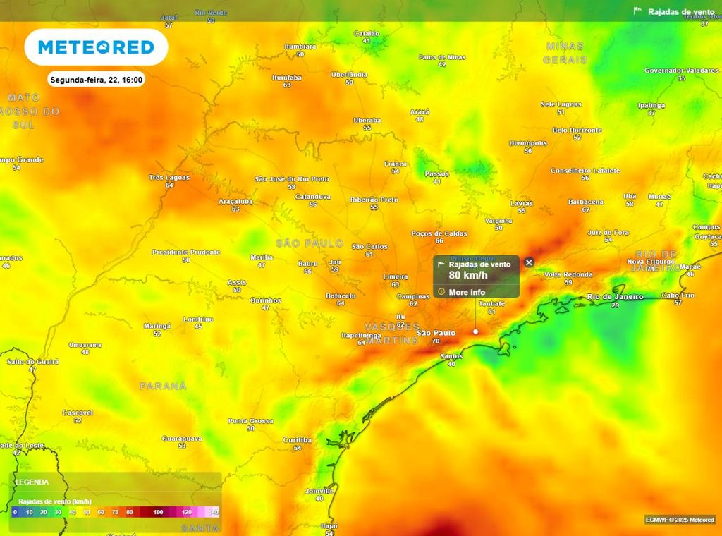 Ainda há alertas para chuvas intensas e tempestades no estado de São Paulo ao longo desta segunda-feira (22), incluindo a região da Baixada Santista que já foi prejudicada pelos fortes ventos. Também são esperadas rajadas de vento acima de 60 km/h até o início da noite, especialmente no leste de São Paulo, onde podem chegar na casa dos 80 km/h.
