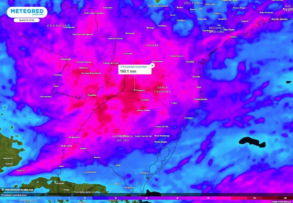 Até a manhã de domingo (15) a chuva dará uma pequena trégua à região Sul, com probabilidade de ocorrência de pancadas isoladas de chuvas no sudoeste do Paraná, oeste de Santa Catarina e noroeste do Rio Grande do Sul. Porém, a partir de segunda-feira (16), o processo de formação de uma baixa pressão ao sul do Uruguai e sua frente fria trará de volta os altos acumulados de chuva nos três estados da região Sul, pelo menos até a próxima semana.