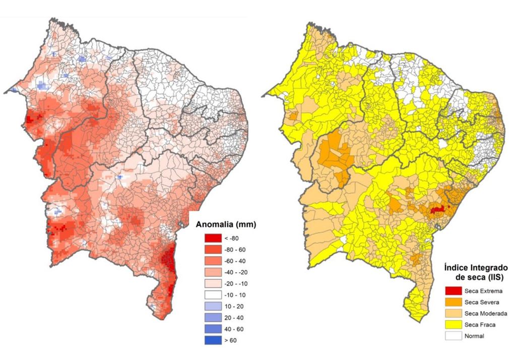Esse é um alerta que o CEMADEN faz em uma outra nota técnica passada à Casa Civil da Presidência da República, a respeito dos danos econômicos, ambientais e humanos do El Niño sobre o Brasil, principalmente no Nordeste. De acordo com os dados levantados pelo Cemaden, 140 municípios nordestinos, distribuídos nos estados da Bahia, Piauí, Paraíba, Rio Grande do Norte e Sergipe, já registram condições de seca severa. Além disso, 6 municípios do centro-norte da Bahia registram condições de seca extrema.