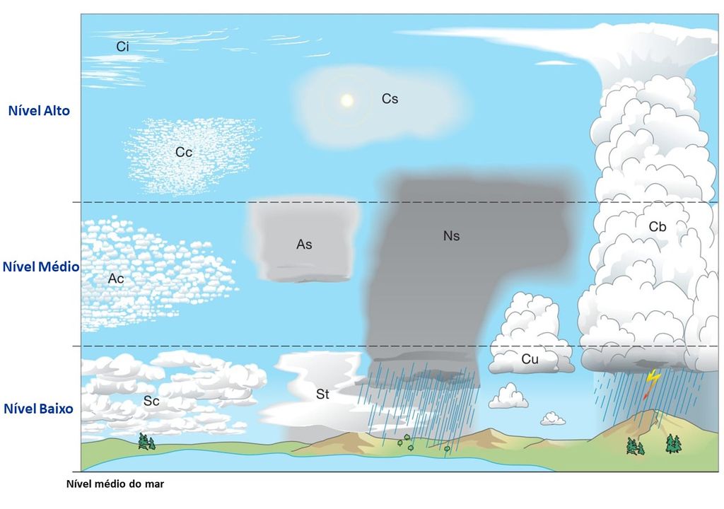 - As Cumulus e Cumunimbus costumam ter suas bases no nível baixo, mas seus topos podem alcançar os outros níveis, principalmente as Cumulunimbus, que podem chegar até a tropopausa.