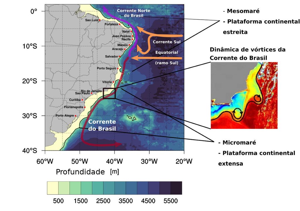"A circulação na plataforma sudeste, especialmente da plataforma média, são lideradas principalmente pelo vento", explica Gregório. Ventos de nordeste promovem correntes para sul na plataforma, enquanto a passagem de uma frente-fria, com ventos sudoestes, inverte esse cenário. "Estamos entrando uma época que as frentes-frias ficam mais escassas, então existe uma tendência de correntes mais voltada para o sul na plataforma", completa.