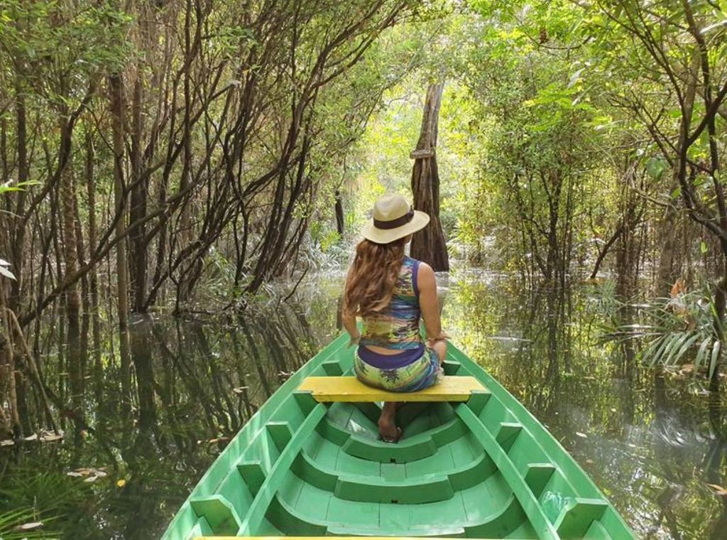 O passeio acontece em uma canoa, sem barulho de motor, para você ouvir o barulho da natureza e dos animais nativos, e apreciar a paisagem espelhada das águas entre os igarapés e árvores.