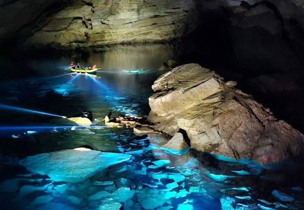 E é de claraboia também que se entra no Buraco das Andorinhas, uma dolina formada há cerca de 30 milhões de anos, que é uma bela lagoa subterrânea de águas cristalinas e intensamente azuis.