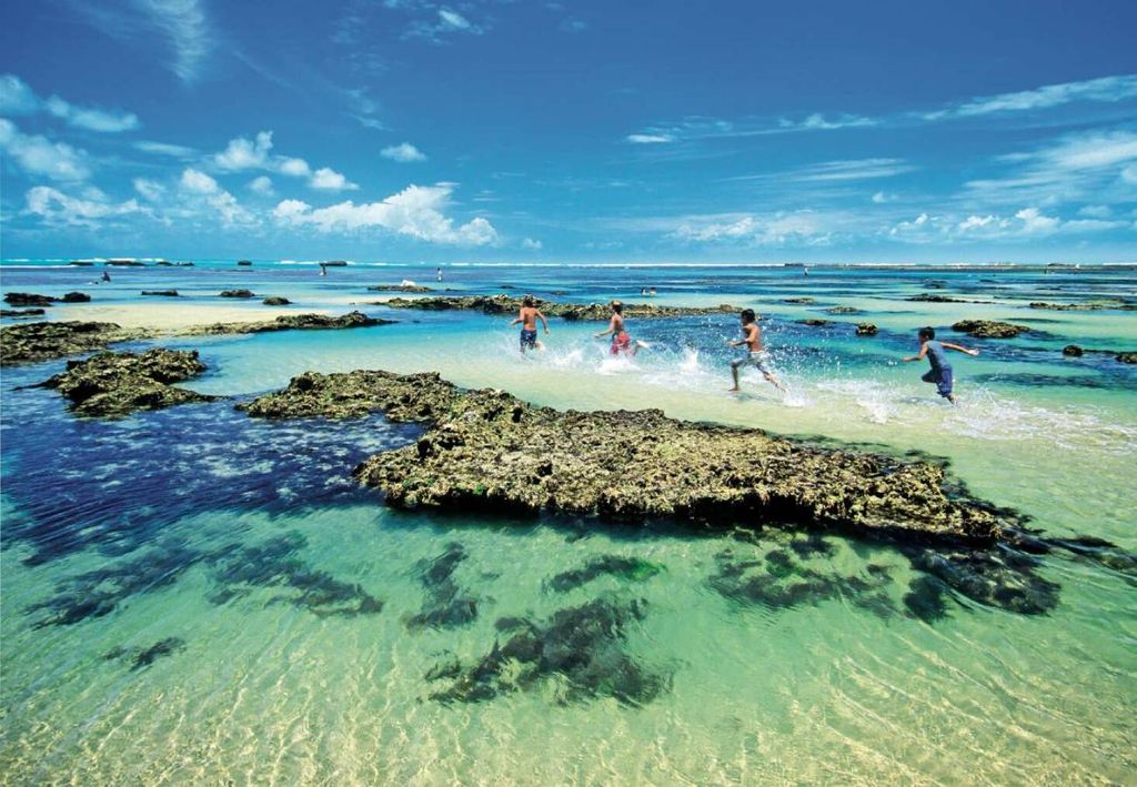 Quando a maré está baixa, piscinas naturais se formam sobre os arrecifes. Há passeios de jangada que vão até essas águas mais profundas para observar a vida marinha.