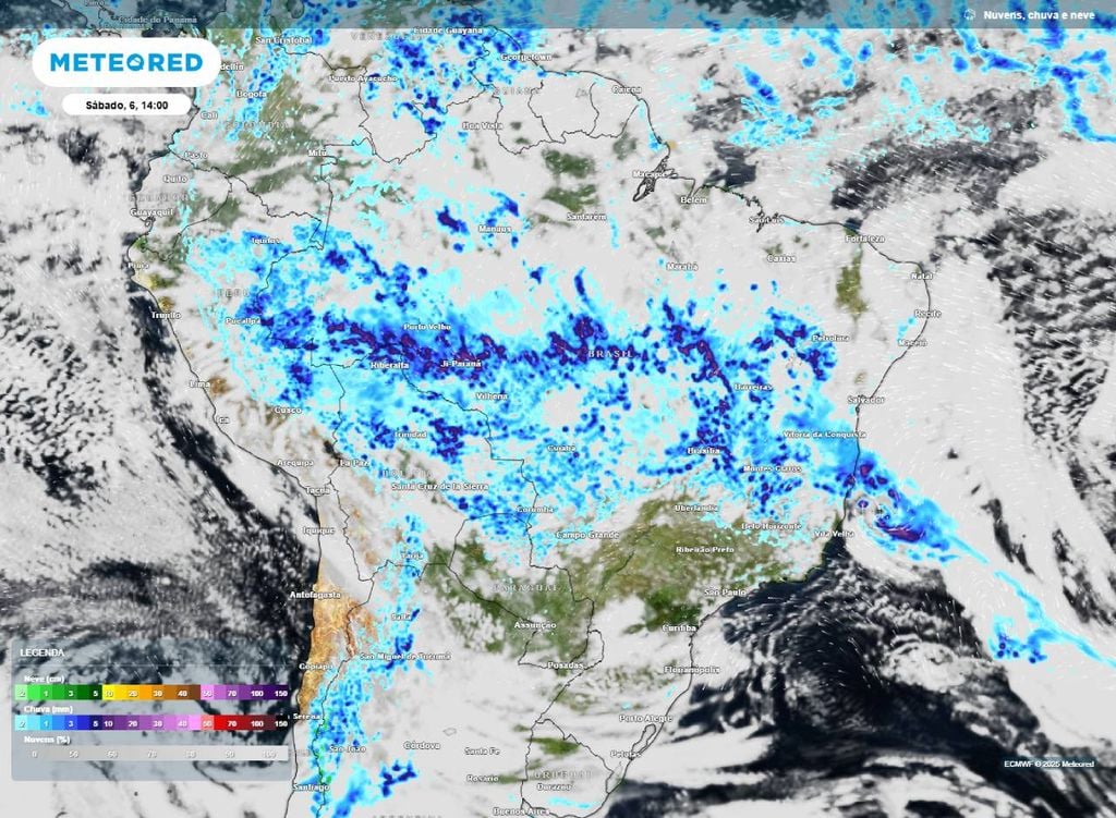 Ao longo do sábado (6) teremos bastante nebulosidade no centro-norte do Brasil. No período da manhã, são esperadas chuvas mais localizadas, de fraca a moderada intensidade, no sul da Região Norte, em áreas da Região Centro-Oeste, em Minas Gerais (especialmente no norte), no Espírito Santo e no sul da Bahia.