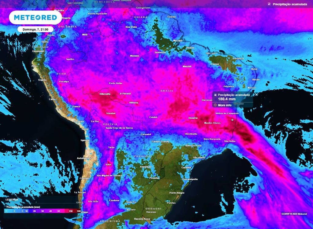 Na área de atuação da ZCAS, os acumulados de precipitação até a noite (21h) do domingo (7) ficam acima dos 120 mm em áreas centrais da Região Centro-Oeste, no norte de Minas Gerais e do Espírito Santo e no extremo sul da Bahia; então, atenção redobrada nessas regiões.