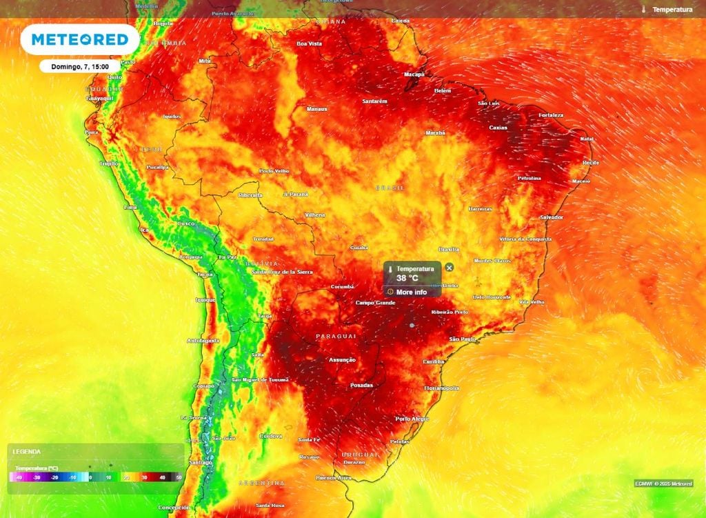 No domingo (7), o calor segue forte, com temperaturas máximas de até 35ºC - 36ºC no Rio Grande do Sul e em Santa Catarina, e de até 38ºC no leste do Mato Grosso do Sul, no norte e noroeste do Paraná e na região de Presidente Prudente (São Paulo).