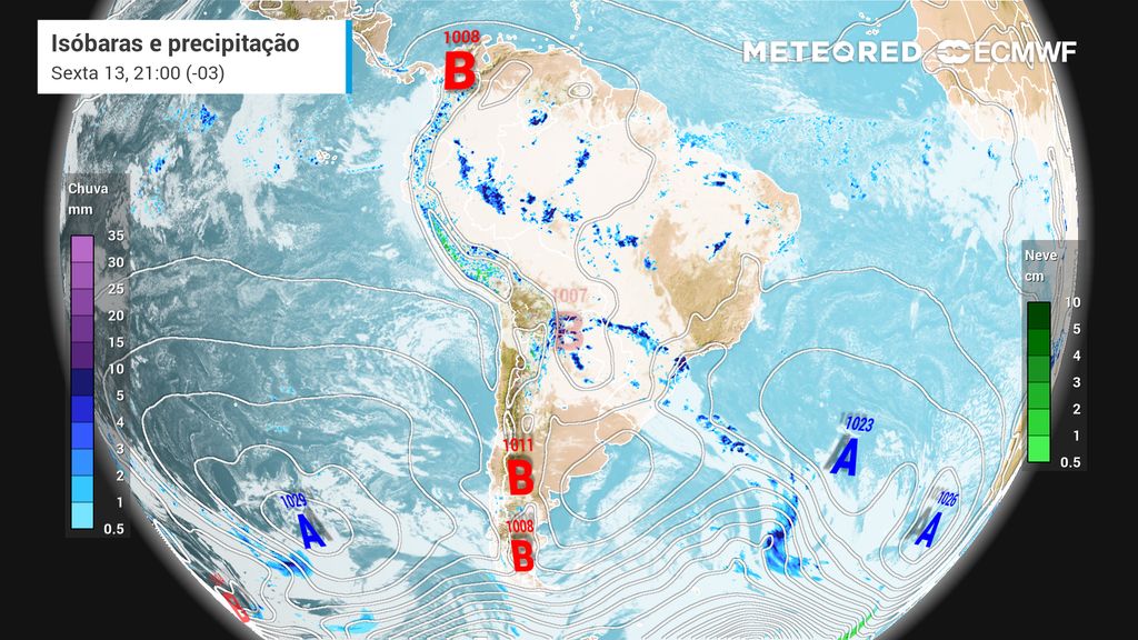 Até o fim da manhã, são esperadas chuvas de intensidade moderada a forte. Além disso, devido às temperaturas elevadas à frente do sistema, há risco de tempo severo, com possibilidade de queda de granizo, fortes rajadas de vento e acumulados expressivos, principalmente no oeste gaúcho.