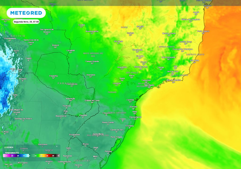 Graças à essa situação, as temperaturas mínimas no Rio Grande do Sul, parte de Santa Catarina, oeste do Paraná e sul do Mato Grosso do Sul podem chegar a valores inferiores a 10°C nesta segunda-feira durante a manhã, como é possível observar no mapa acima.