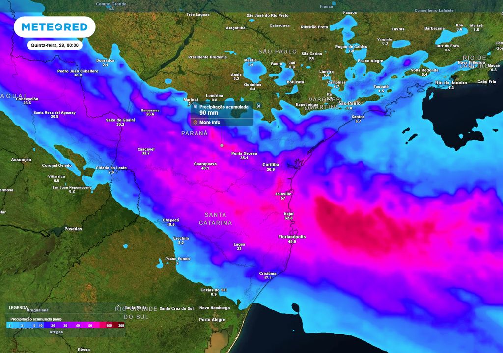 Felizmente, já na quarta-feira (27), as chuvas estarão se dissipado na maior parte da região mencionada. Permanecem apenas chuvas fracas na região litorânea do Paraná e de Santa Catarina. A tendência é, portanto, que a partir desse dia volte a predominar o tempo seco e o céu aberto.