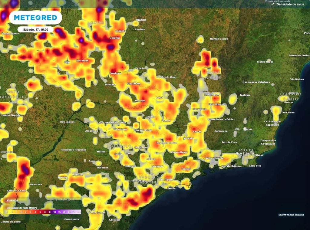 Durante a noite do sábado (17) as chuvas continuam acontecendo nestas áreas, porém de forma mais fraca do que no período da tarde. Elas ocorrem com até moderada intensidade, mas podem vir acompanhadas por descargas elétricas.