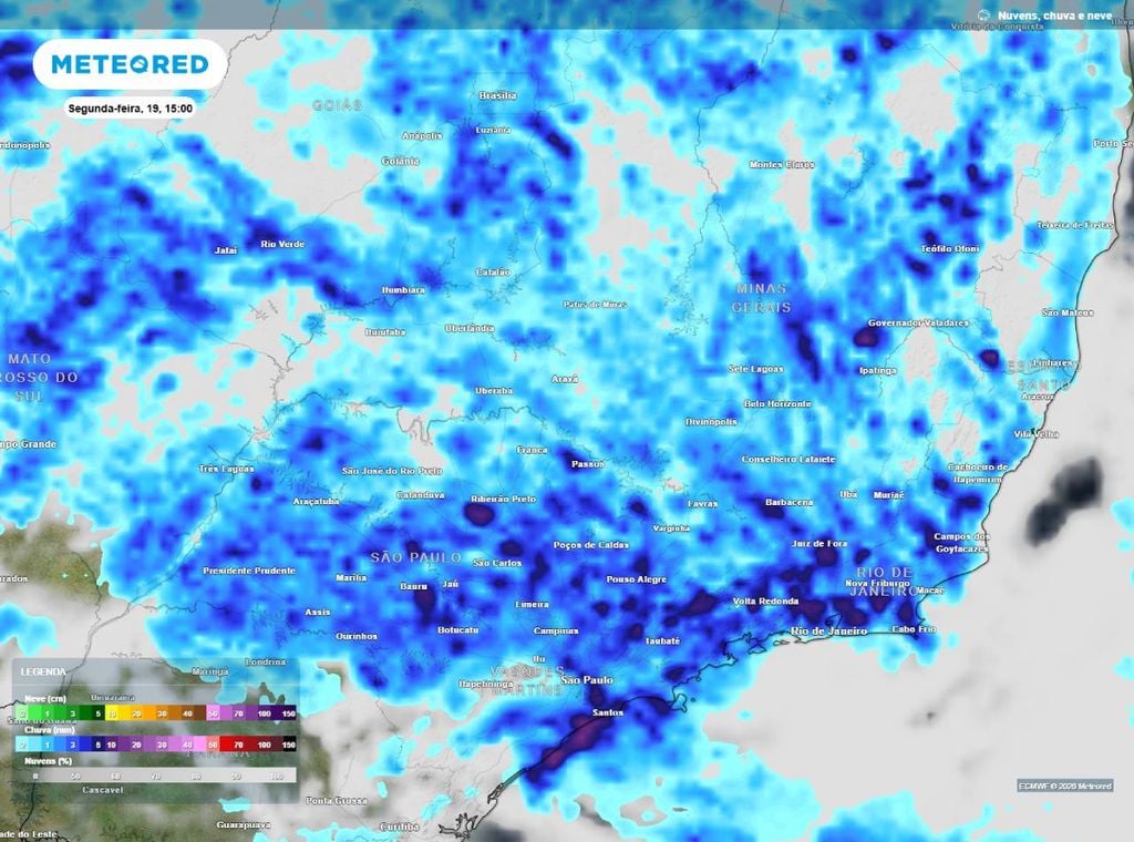 Na segunda-feira (19), a frente fria já estará nas proximidades da costa do Sudeste, e contribuirá para o aumento das instabilidades na Região. No período da manhã, ocorrem chuvas de até moderada intensidade no centro-leste paulista, no estado carioca e no sul e leste mineiros, incluindo as capitais.