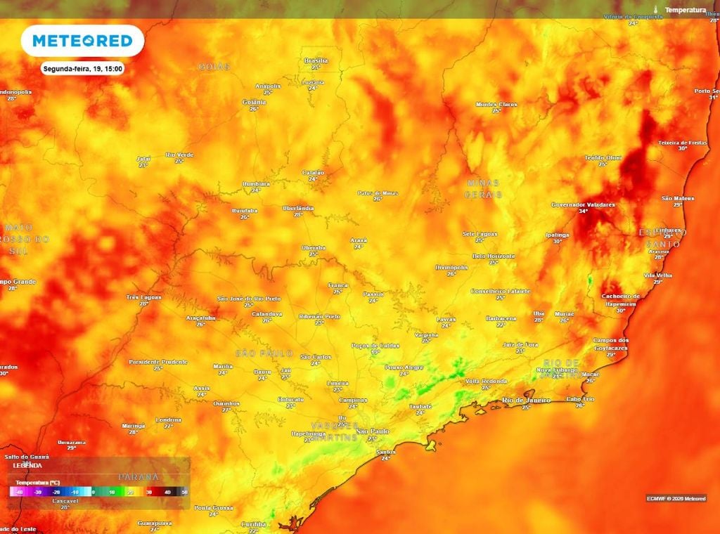 Após dias de temperaturas elevadas, especialmente no estado carioca, onde foram registrados valores acima de 40°C no início desta semana, as máximas não passam dos 30°C nesta segunda-feira (19) em praticamente toda a Região Sudeste, conforme pode ser observado no mapa abaixo.