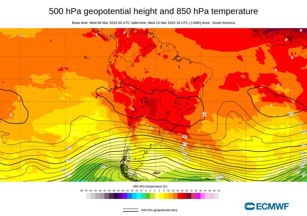Na quarta-feira (13) o modelo do ECMWF está prevendo temperaturas máximas entre 32 a 36°C em diversas partes do centro-sul do Brasil, como o Rio Grande do Sul, oeste de Santa Catarina, noroeste do Paraná, noroeste de São Paulo, grande parte do Mato Grosso do Sul e sudoeste do Mato Grosso. Nas demais partes dessas regiões as máximas deverão ficar próximas dos 30°C.