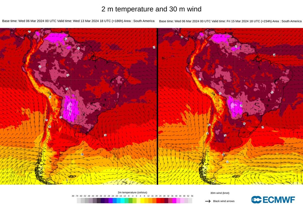 Inclusive não podemos deixar de mencionar os países vizinhos a essas regiões mencionadas. No sul da Bolívia, Paraguai e norte da Argentina o modelo do ECMWF prevê temperaturas que facilmente poderão atingir os 40°C e inclusive passar disso, como é o caso do Paraguai, onde as temperaturas poderão chegar a 44°C!