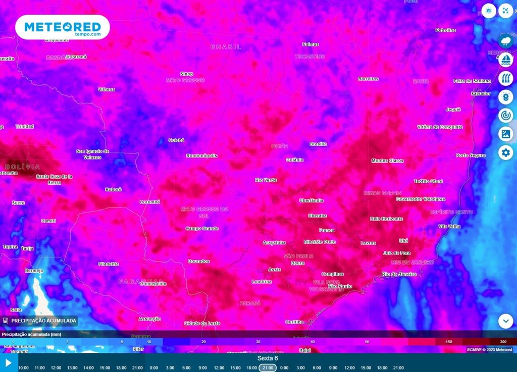 Na quarta-feira, a frente fria avança com mais força sobre o Sudeste provocando tempestades e chuvas generalizadas. Essas chuvas deverão ocorrer ao longo de todo o dia pelo estado de São Paulo e entre o período da tarde e noite nos estados de Minas Gerais e Rio de Janeiro. Os maiores acumulados são esperados para os estados de São Paulo e Rio de Janeiro, com uma atenção especial ao litoral desses estados e região serrana.