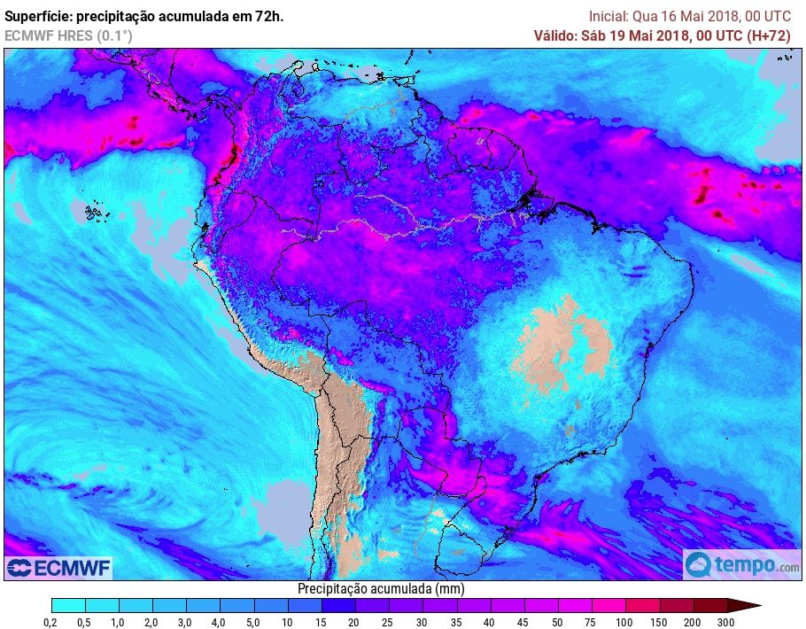 Nesta quinta-feira (17), uma frente fria se encontra no oceano na altura do ES. Essa condição contribui para o tempo nublado no estado capixaba, no leste de MG e no sul da BA, com ocorrência de chuva fraca entre o fim da manhã e o início da tarde. A posição desse sistema também favorece um aumento na concentração de nuvens no Centro-Oeste, mas não há previsão de chuva para a Região, somente para o noroeste do MT e metade sul do MS.