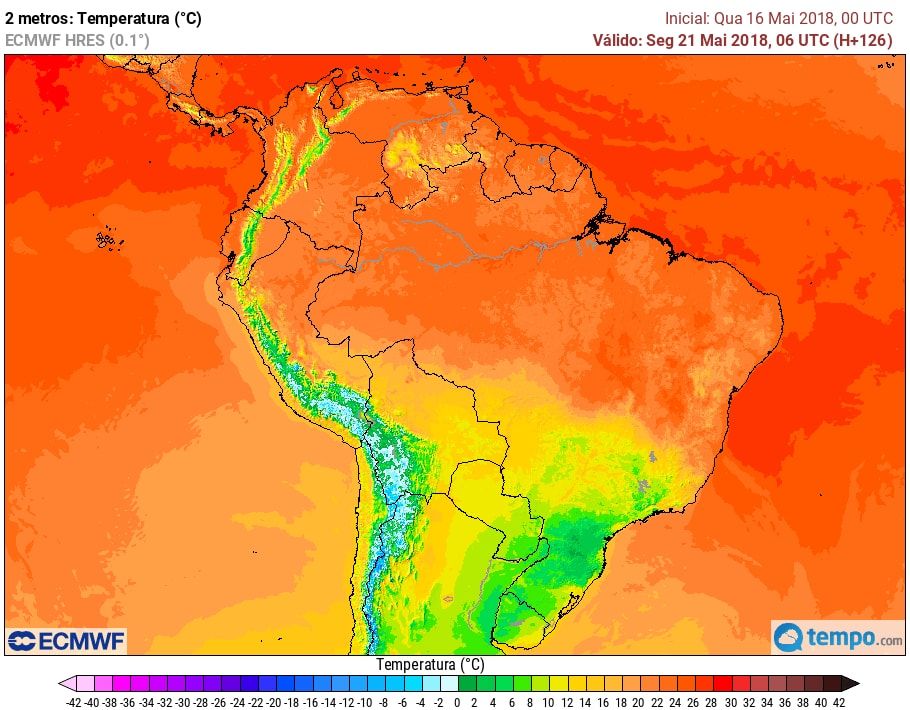 Com o avanço da frente fria até o Centro-Oeste e Norte do país no fim do dia de sábado (19), as temperaturas em todo o Centro-Sul do país diminuem bastante, provocando bastante frio o fenômeno de friagem para as áreas mais ao norte. Na Região Sul, além do frio, os ventos de sul são mais intensos contribuindo para o aumento da sensação de frio, principalmente no estado do RS.