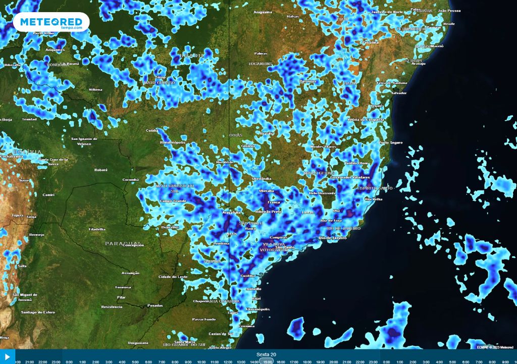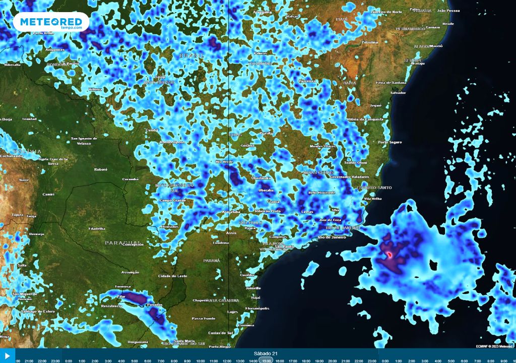 No sábado (21), tempo mais instável e potencial de chuvas de moderada a forte intensidade já ocorrem pela manhã, concentradas na primeira parte do período, no norte de São Paulo, no Triângulo Mineiro e na porção central de Minas Gerais, com redução da intensidade no restante da manhã. No leste paulista e no Rio de Janeiro, chove com fraca intensidade.
