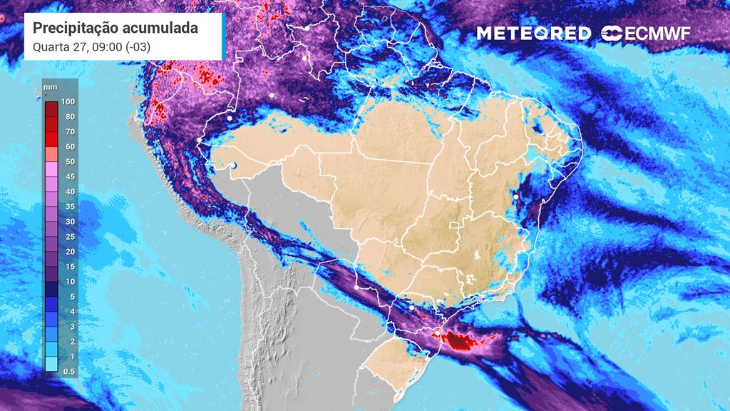 Nos últimos dias, a formação de um ciclone extratropical e a atuação de um sistema frontal na Região Sul do Brasil provocaram acumulados de mais de 100 mm no Rio Grande do Sul e em Santa Catarina, com chuvas menos volumosas, mas acompanhadas de trovoadas no oeste do Paraná. Além do elevado acumulado, foram relatados queda de granizo.