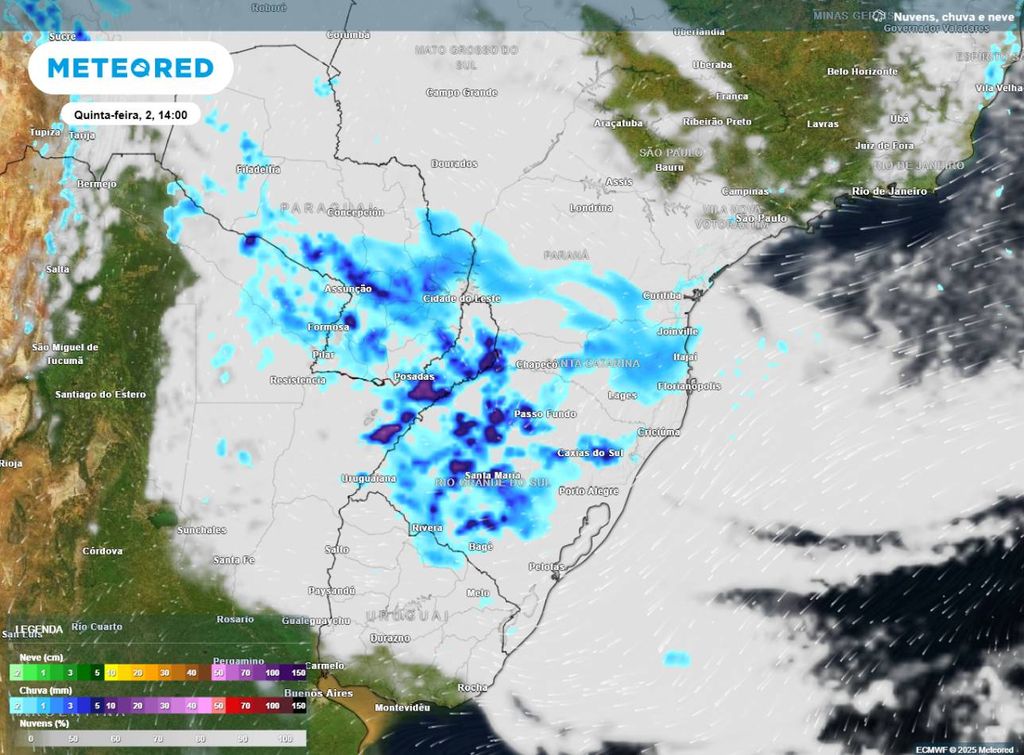 Porém, na quinta-feira (2), as chuvas retornam com força à Região Sul já no período da manhã, especialmente no Rio Grande do Sul. No estado gaúcho, as áreas afetadas serão o norte, o oeste, região central e Região da Campanha, onde as chuvas ocorrem com até forte intensidade e acompanhadas por tempestades. Na porção centro-sul do Paraná e em Santa Catarina também são esperadas chuvas contínuas ao longo da quinta-feira (2), porém, estas não serão intensas.