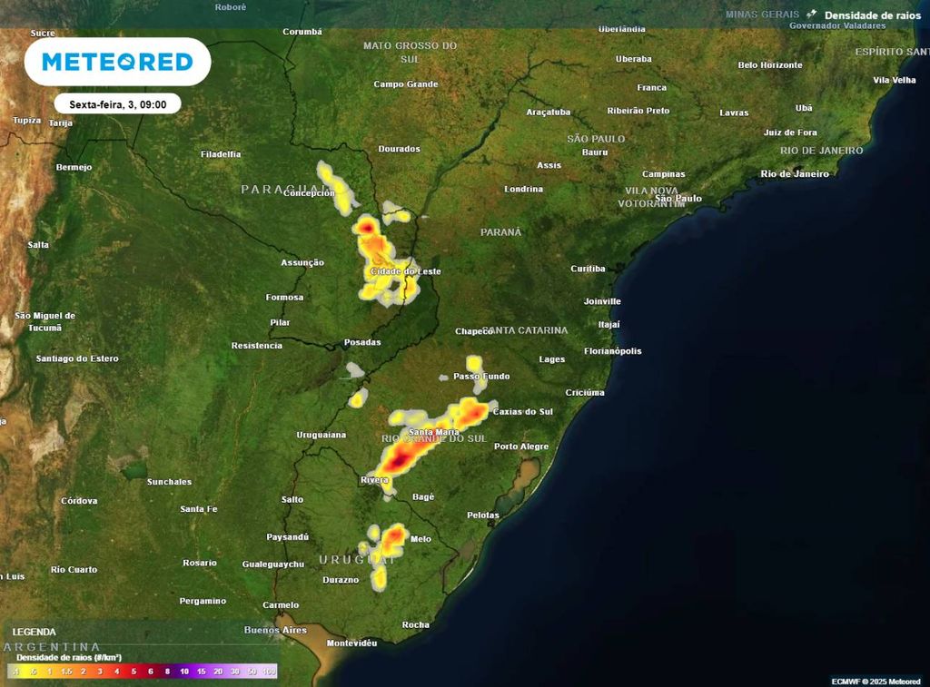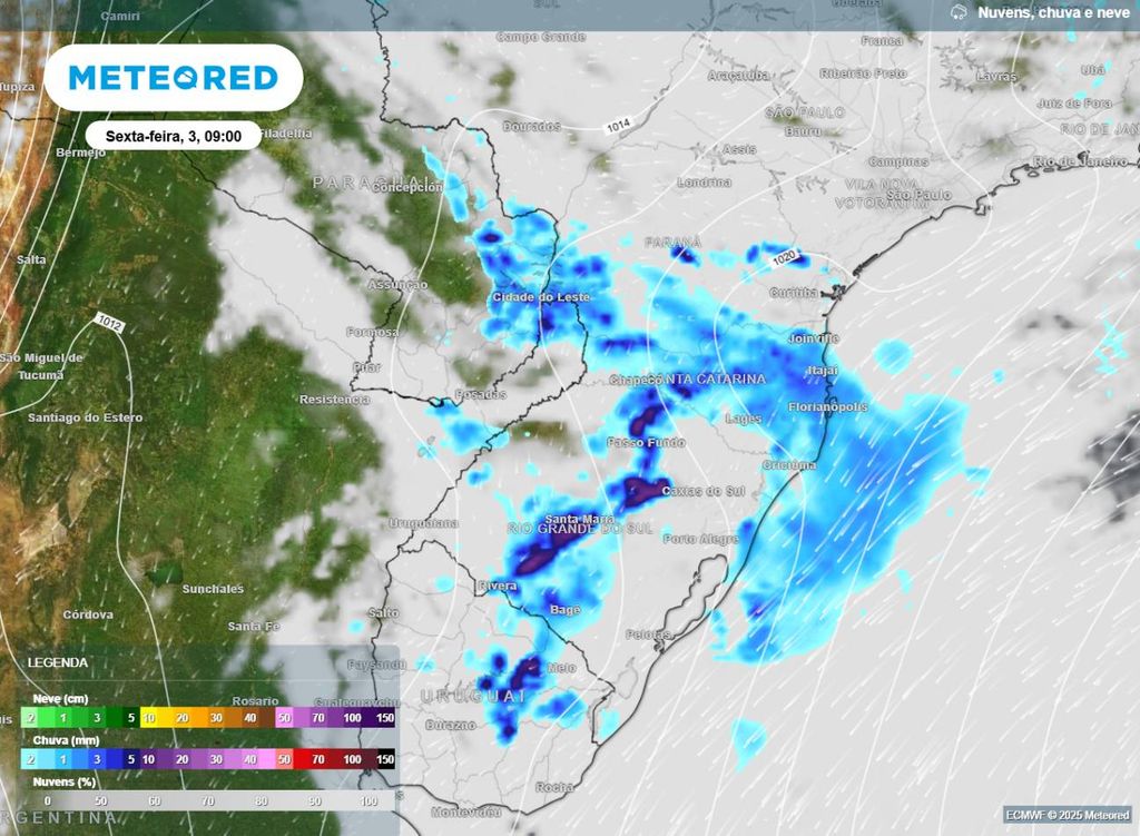 Na sexta-feira (3), as condições do tempo na região são semelhantes às do dia anterior. Já a partir do período da manhã, são esperadas chuvas no centro-sul e leste do Paraná e no estado catarinense, que podem ocorrer de forma pontualmente intensa.