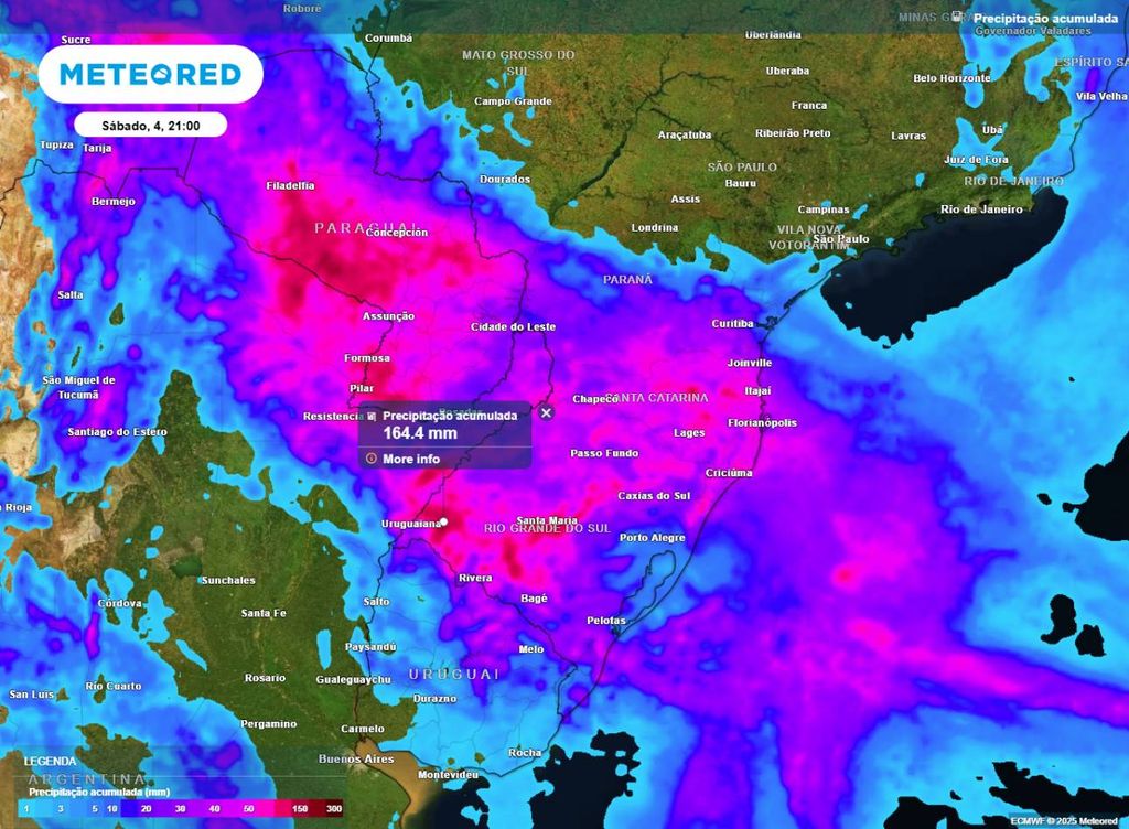 Já no Rio Grande do Sul, os maiores acumulados serão registrados em áreas do centro e do oeste do estado, onde ultrapassam os 110 mm, e podem chegar na casa dos 160 mm no oeste.