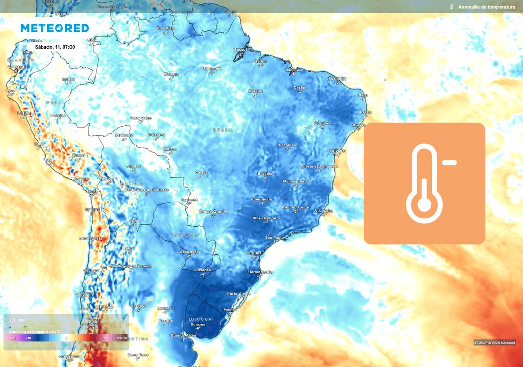 O amanhecer de sábado (11) será de temperaturas abaixo da média em praticamente todo o país. As maiores anomalias (desvios) de temperatura, contudo, ficam sobre o centro-sul, onde a massa de ar frio atua. No Rio Grande do Sul, leste de Santa Catarina e no Vale do Paraíba paulista o amanhecer será até 7°C abaixo da média.
