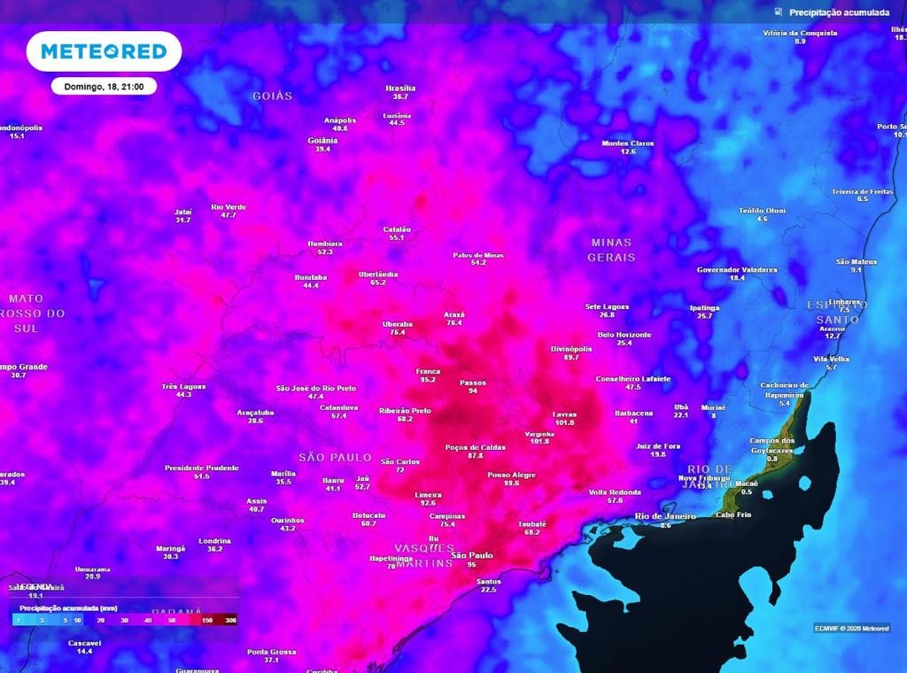 Os acumulados de chuva até a noite do domingo (18) chegam aos 100 mm em áreas do leste e do norte de São Paulo e no sul de Minas Gerais, na região de divisa entre os dois estados, conforme podemos observar no mapa abaixo.