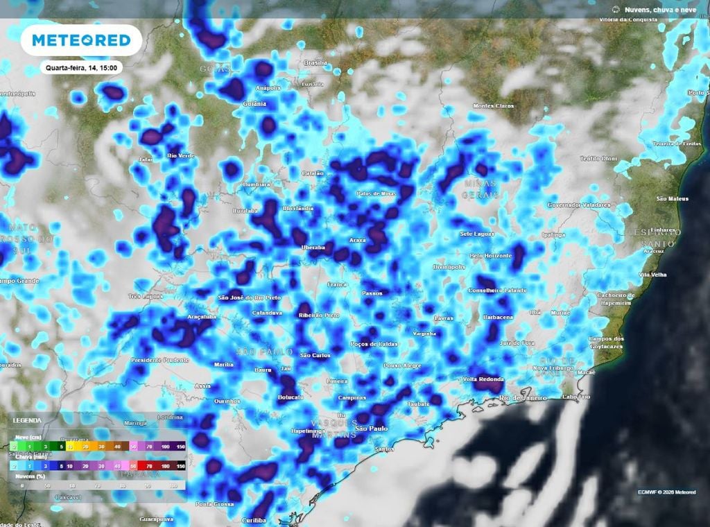 Ao longo da semana, os dias começarão com sol entre muitas nuvens, o que mantém a sensação de abafamento nestes três estados, especialmente em São Paulo e no centro-sul de Minas Gerais.