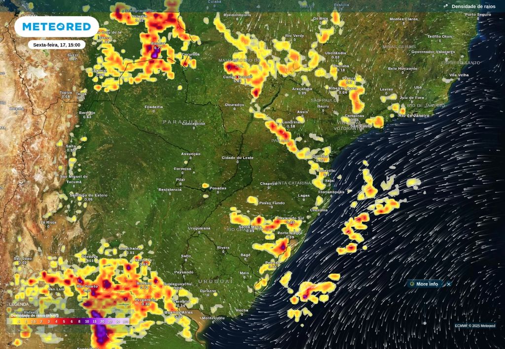 No Rio Grande do Sul as tempestades começam a se formar na região noroeste no fim da manhã e cruzam o estado em direção ao sul ao longo da tarde, com potencial de severidade. O mapa abaixo mostra a densidade de raios prevista para às 15h, destacando também a ocorrência de tempestades isoladas também no norte do Paraná.