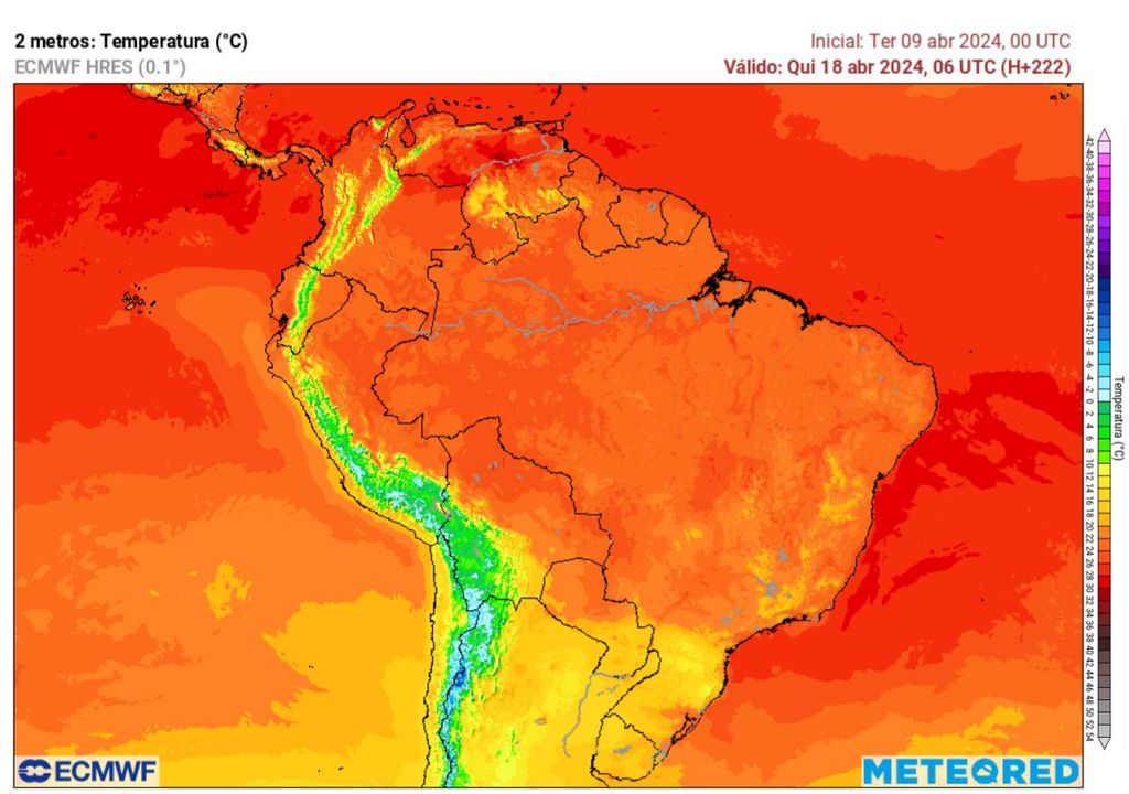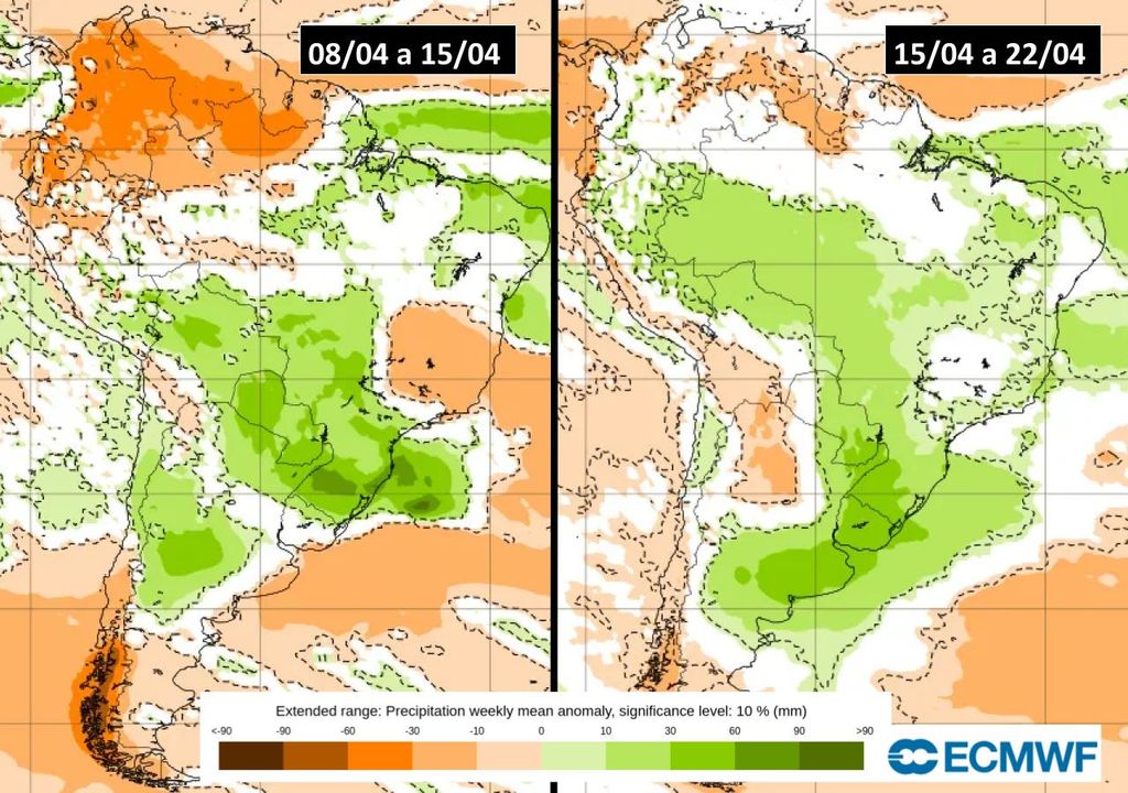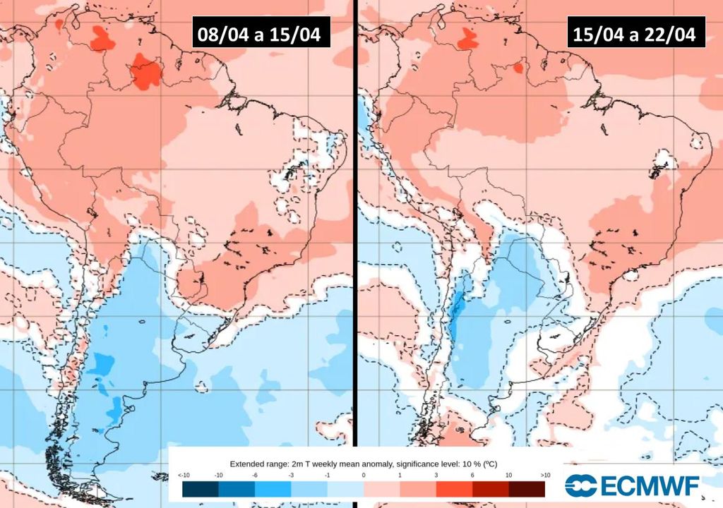 Agora, a tendência para a próxima semana é de temperaturas mais altas e acima da média em praticamente todo o país, principalmente na região Sudeste. Na região Sul, por conta da formação e atuação da baixa pressão, as temperaturas deverão ficar próximas à média, sem previsão de anomalias negativas intensas de temperatura. Somente por volta dos dias 17 e 18 de Abril o modelo prevê a formação de uma nova frente fria que avançará pelo Sul, diminuindo novamente as temperaturas, principalmente no oeste do Rio Grande do Sul e Santa Catarina.