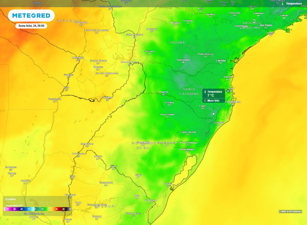 Segundo o modelo de confiança da Meteored, a manhã da sexta-feira (24) será de tempo firme na Região Sul, e com bastante nebulosidade no Rio Grande do Sul e no leste de Santa Catarina e do Paraná.