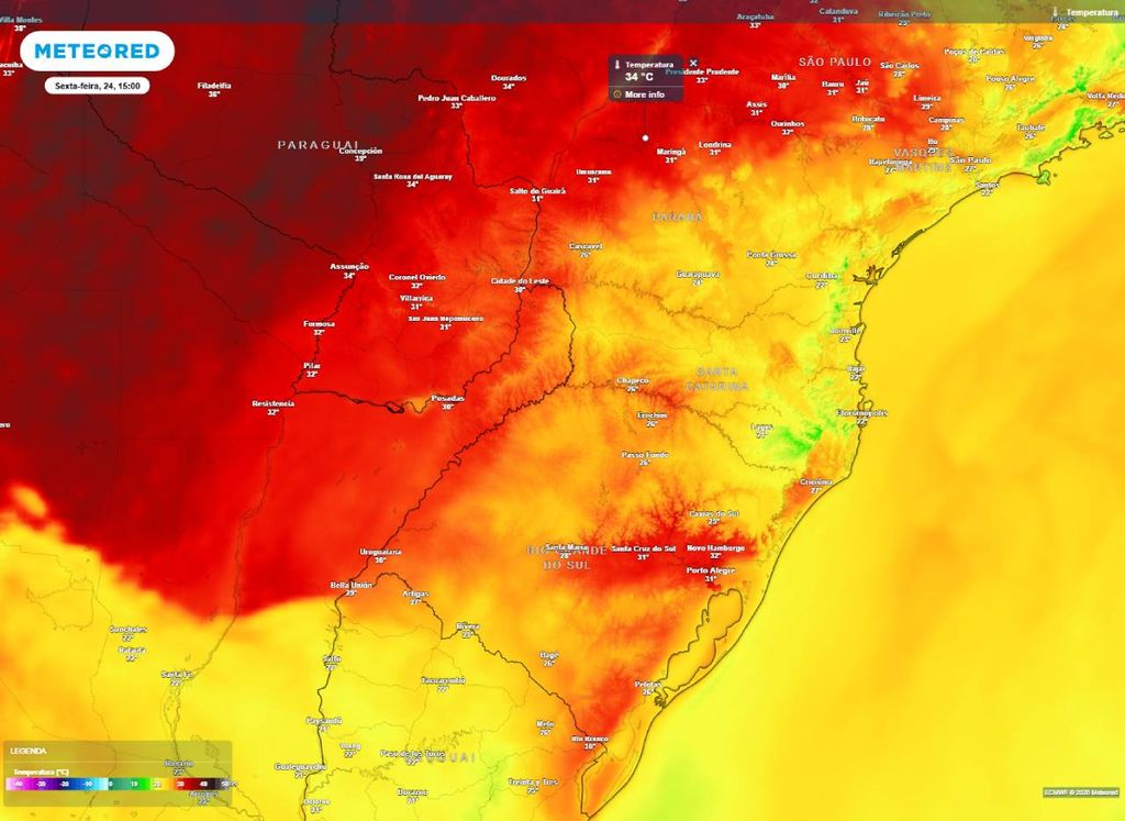 Contudo, a sexta-feira (24) ainda será de tempo firme e calor na Região Sul do país. A condição pré-frontal faz os termômetros superarem os 30°C e deixa o tempo com muitas nuvens e até certa sensação de abafamento.