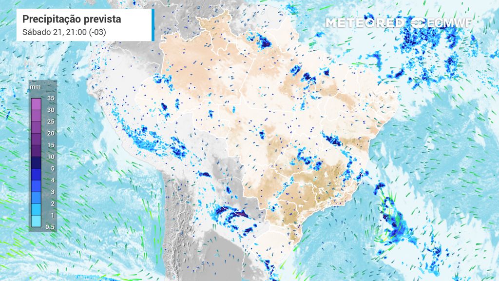 Nas demais áreas sob influência do canal de umidade, os volumes tendem a ser menores. Em São Paulo, os acumulados chegam a cerca de 20 mm, enquanto em Mato Grosso do Sul não devem ultrapassar 15 mm. Já em Goiás e Mato Grosso, os valores variam, com maiores volumes previstos para o norte mato-grossense, podendo atingir até 50 mm.