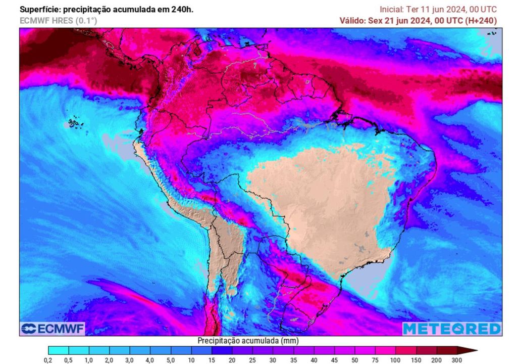 De acordo com o modelo ECMWF, nenhuma chuva é esperada para o Sudeste e Centro-Oeste do Brasil até o dia 21 de junho, com a atuação das frentes frias ficando bem restrita aos estados do Sul do Brasil, talvez exercendo uma mínima influência no sul do Mato Grosso do Sul. Outra exceção é uma pequena porção nordeste da região Sudeste, que abrange uma pequena parte dos estados do Espírito Santo e Minas Gerais, onde pancadas de chuvas poderão ocorrer devido a influência do escoamento de ventos que provoca chuvas na região Nordeste, porém os acumulados serão baixos.