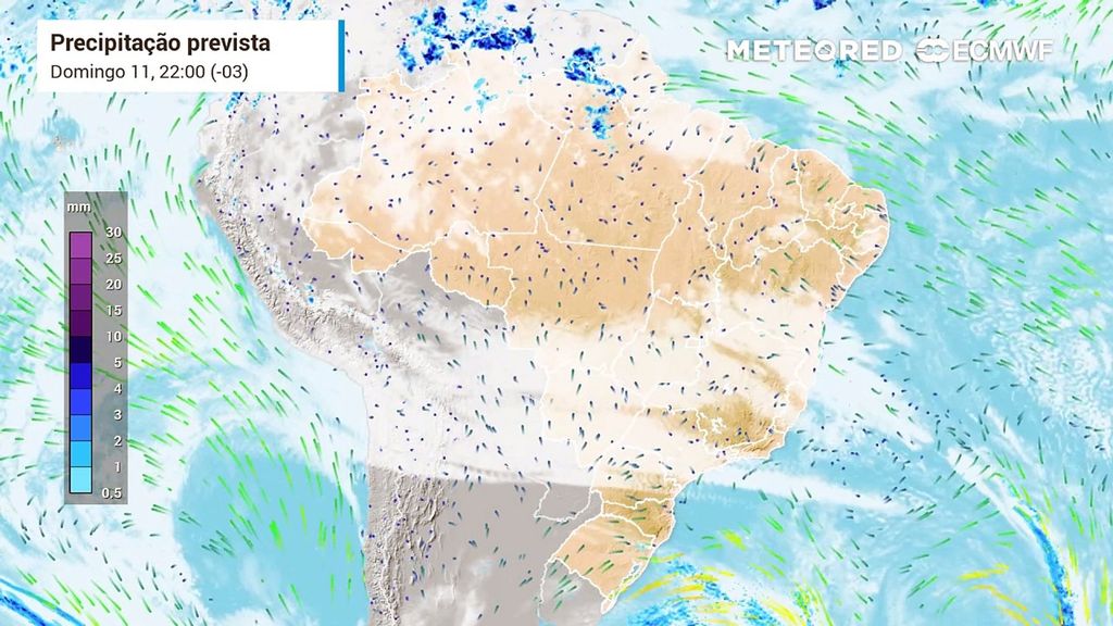 Esse mesmo sistema mantém o tempo firme e praticamente sem nuvens em boa parte do Brasil na próxima semana. Por outro lado, ao se deslocar para o oceano, há o favorecimento da atuação dos ventos de leste, que transportam umidade do oceano para parte do leste da Região Nordeste.