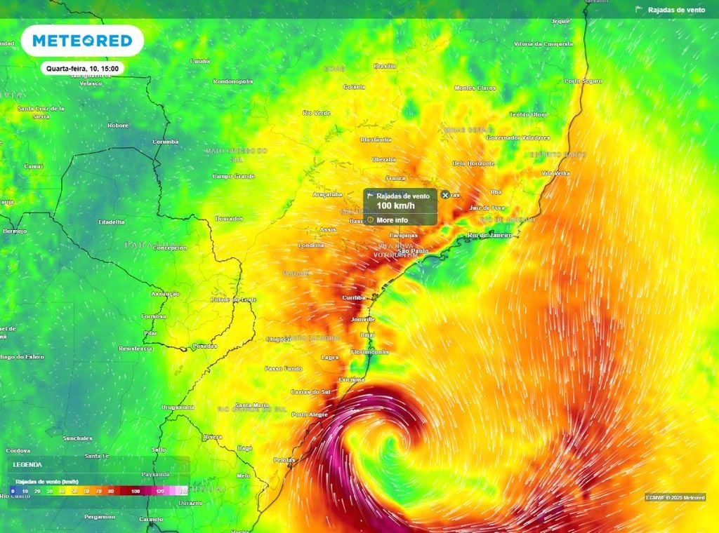 Na quarta-feira (10), o ciclone extratropical e sua frente fria associada continuam mantendo o tempo instável nas Regiões Sul e Sudeste, com riscos de chuvas intensas em alguns pontos, temporais isolados (especialmente em Minas Gerais), eventual queda de granizo e fortes rajadas de vento acima dos 80 km/h e podendo chegar aos 100 km/h no leste de São Paulo, leste do Paraná e litoral do Rio Grande do Sul.