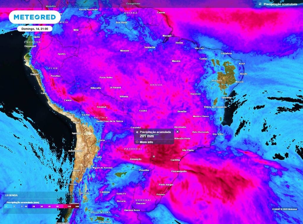 Até a noite (21h) do domingo (14), os volumes totais ficam acima dos 120 mm no centro-sul gaúcho, no norte catarinense, no Paraná, no centro-sul de São Paulo e no centro-leste do Mato Grosso do Sul. Contudo, o destaque ainda fica para áreas do oeste do Paraná, onde os acumulados atingem os 200 mm, mas podendo localmente até ultrapassar este valor.