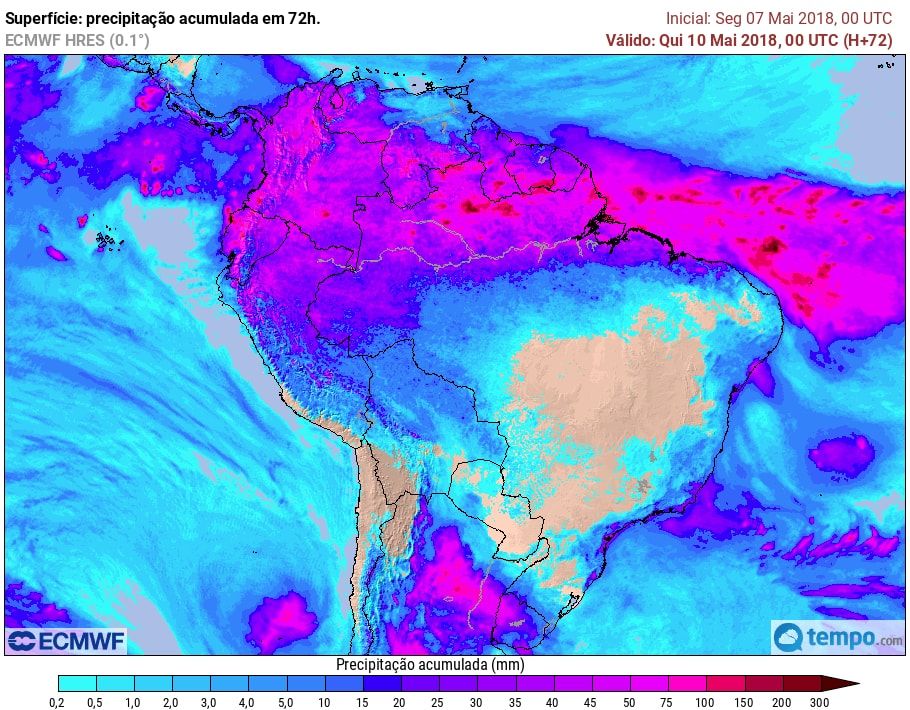 No fim de semana a umidade ficou concentrada no Centro-Sul e extremo norte do país, com registro de chuva moderada no litoral de SC e do RS, e de chuva mais intensa no litoral nordestino, mais precisamente na BA, PE, CE e MA. Na porção mais central, o predomínio foi de tempo firme e ensolarado, com temperaturas acima dos 30°C no MS, MT e TO.