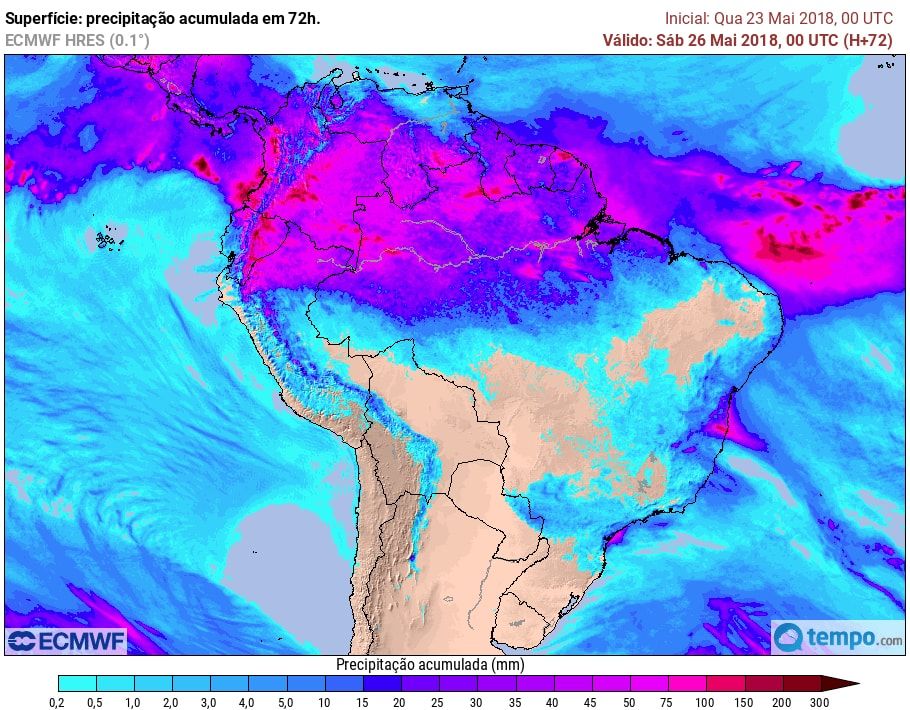 Já entre o norte do ES e a capital Salvador, o transporte de umidade é mais efetivo. Assim, o tempo fica nublado e com chuva ao longo do dia em todo o leste baiano, sendo a região entre Porto Seguro e Salvador, onde a chuva ocorre de moderada a forte intensidade, trazendo potencial para transtornos. Previsão de pancadas de chuva a partir do fim da manhã entre o MA e o estado do AP, com alerta de chuva volumosa para a região metropolitana de Belém.
