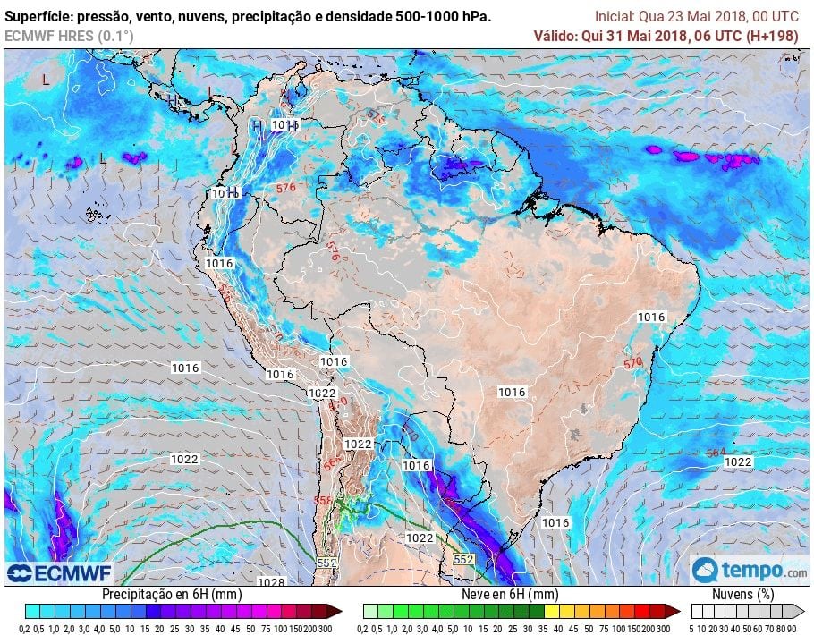 Esse sistema consegue avançar até o Sudeste e Centro-Oeste, não alcançando as áreas mais ao norte do país. Em relação à massa de ar polar, a previsão é de que não seja tão intensa quanto à anterior. No entanto, está muito longe para dar muitos detalhes, sendo necessário um acompanhamento nos próximos dias.
