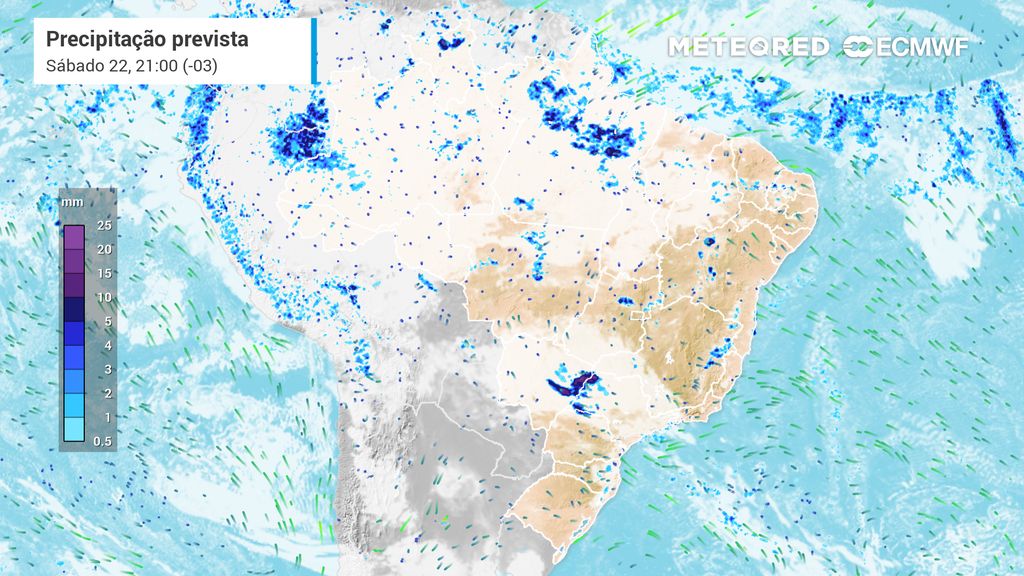 A massa de ar quente presente na porção central do Brasil parece estar perdendo intensidade a partir deste sábado (22). O modelo de confiança da Meteored | Tempo.com indica pequena queda nas temperaturas e maior presença de nebulosidade sobre a região.